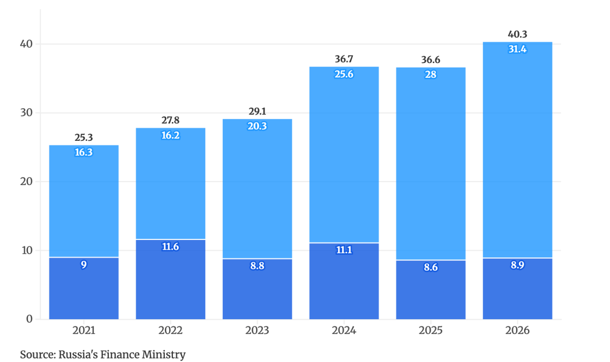 Харин эдийн засгийн зогсонги байдалтай холбоотойгоор батлан хамгаалахын салбарт 2025 онд 168,8 тэрбум доллар зарцуулсан бол 2026 онд 161,6 тэрбум доллар зарцуулахаар төлөвлөжээ. Гэвч бодит байдал дээр зардал нь үүнээс хамаагүй илүү байх магадлалтай. ОХУ батлан хамгаалах салбарын зардлын тайлангаа нийтэлдэггүй, харин зарцуулах төлөвлөгөөгөө мэдээлдэг.